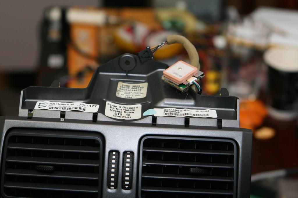 Instead of using the provided USB cable, I took the plug and re-pinned it onto the 8 core flat cable (under carpet RJ12 lead?) leaving the other 4 wires for the GPS receiver. There is no shielding on this cable so I tried to keep the length reasonably short but keeping in mind that even if it only worked at USB 1 or 1.1 speeds, that’s enough for a touch screen overlay and 4800 baud GPS. The GPS was trivial. I unscrewed it out of its case and literally glued it to the space right near where the analogue clock mounts in my car at the top of the ICC.