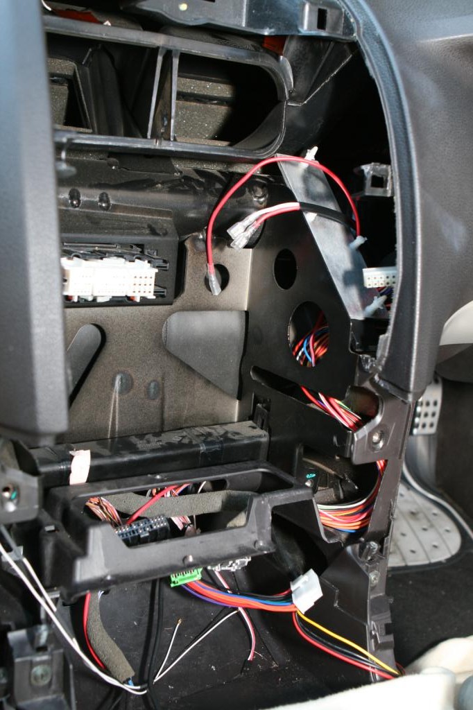 A 10mm socket should let you undo the negative battery terminal and just put this to the side. It’s very important that you disconnect the battery before unplugging the connectors to the bottom of the ICC, if you still have the battery connected and disconnect the ICC you get a message that says “Security Code Error” and a lot of angry beeps. With your hand you can reach up where the tissue box used to be and on the bottom of the ICC you should be able to feel 5 plugs. 4 of these are large square connectors and the 5thone at the front right will be the radio antenna. Start by pulling the antenna lead out (pulls to the right) and then disconnect the rest of the plugs. Going left to right there is: